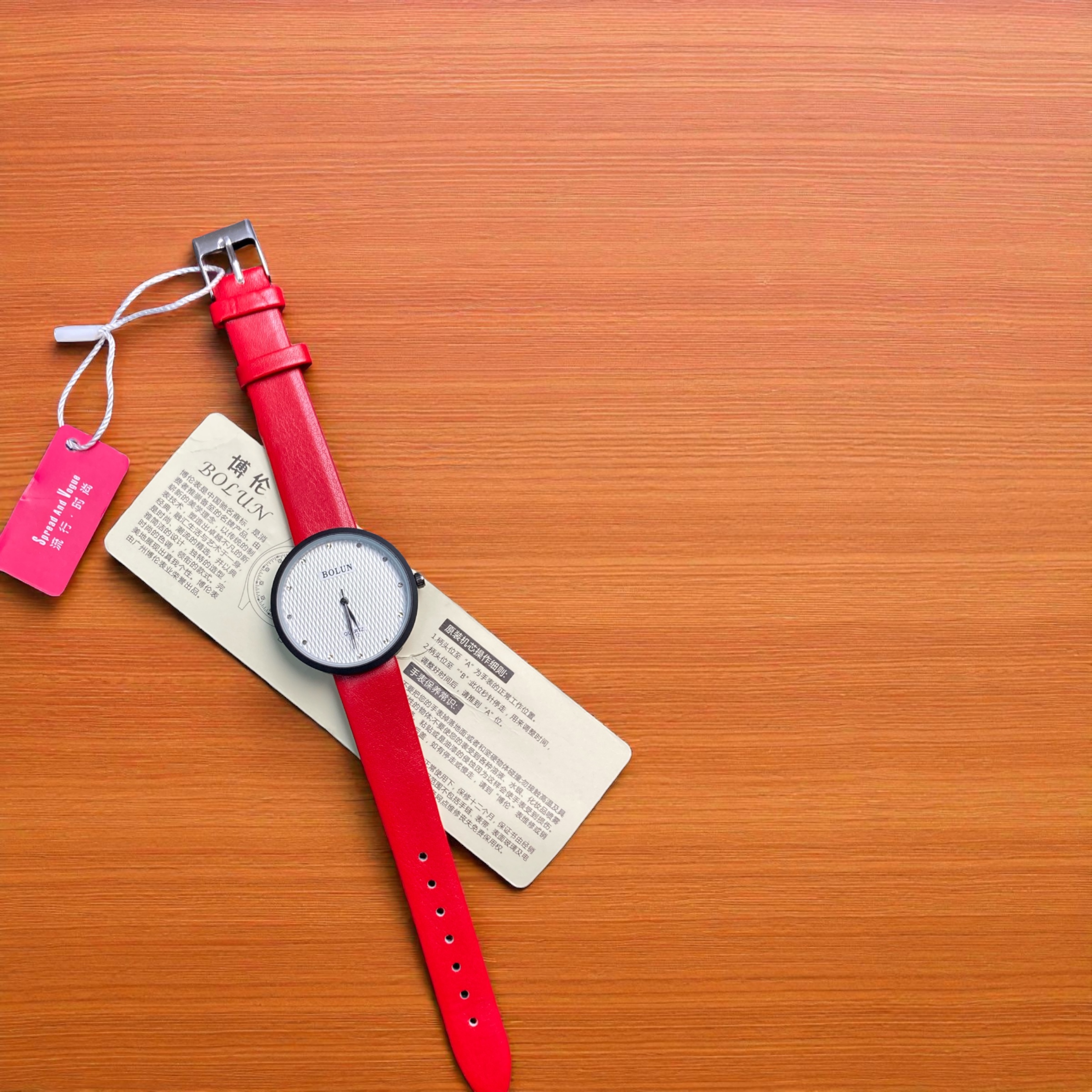 عنوان: ساعت مچی زنانه BOLUN با بند چرمی قرمز و بدنه استیل – ترکیب ظرافت، سادگی و کیفیت
