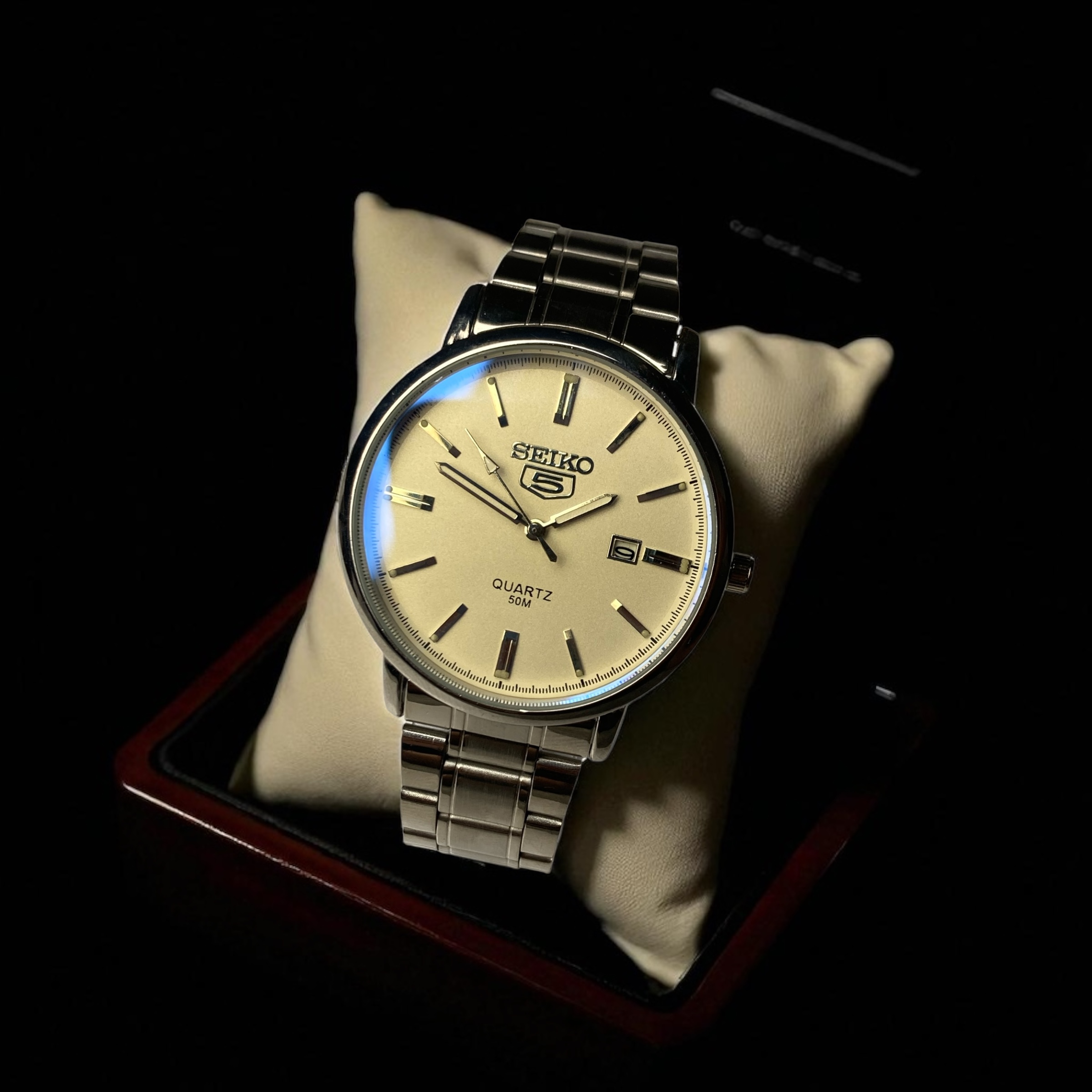 یکی از مزایای اصلی این ساعت، راحتی آن در استفادهی روزمره است. بند استیل با طراحی ارگونومیک و قفل محکم، باعث میشود ساعت بهخوبی روی مچ دست بنشیند. وزن آن متعادل است؛ بهطوریکه حس حضور یک ساعت باکیفیت را القا میکند، اما سنگین و آزاردهنده نیست. این ویژگیها باعث میشود ساعت SEIKO همراهی مطمئن برای شما در تمام طول روز باشد.