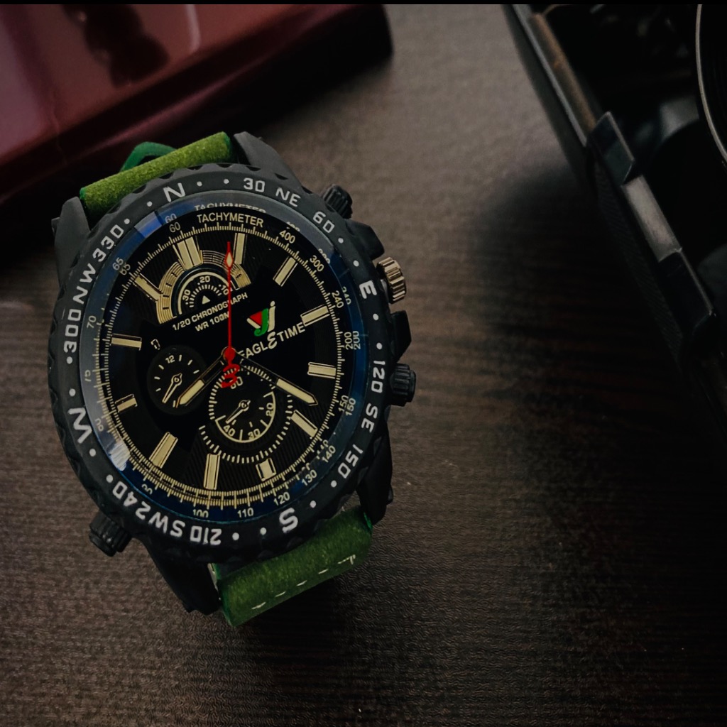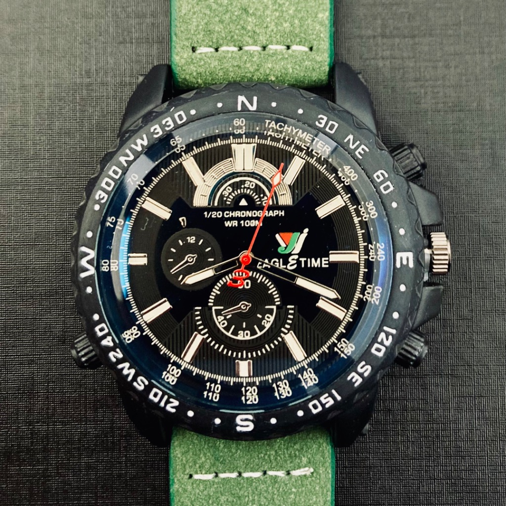 ساعت مردانه EAGLE TIME ایگل تایم: این برند ساعت مردانه سایز Lبزرگ برای اولین بار ساعتی با بند یشمی معرفی کرده است که باعث شده تا این ساعت خاص بنظر آید و همچنین مشکی بودن خود ساعت با طراحی شیک آن را منحصربه فرد کرده است.